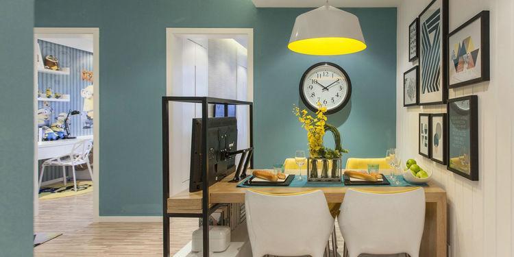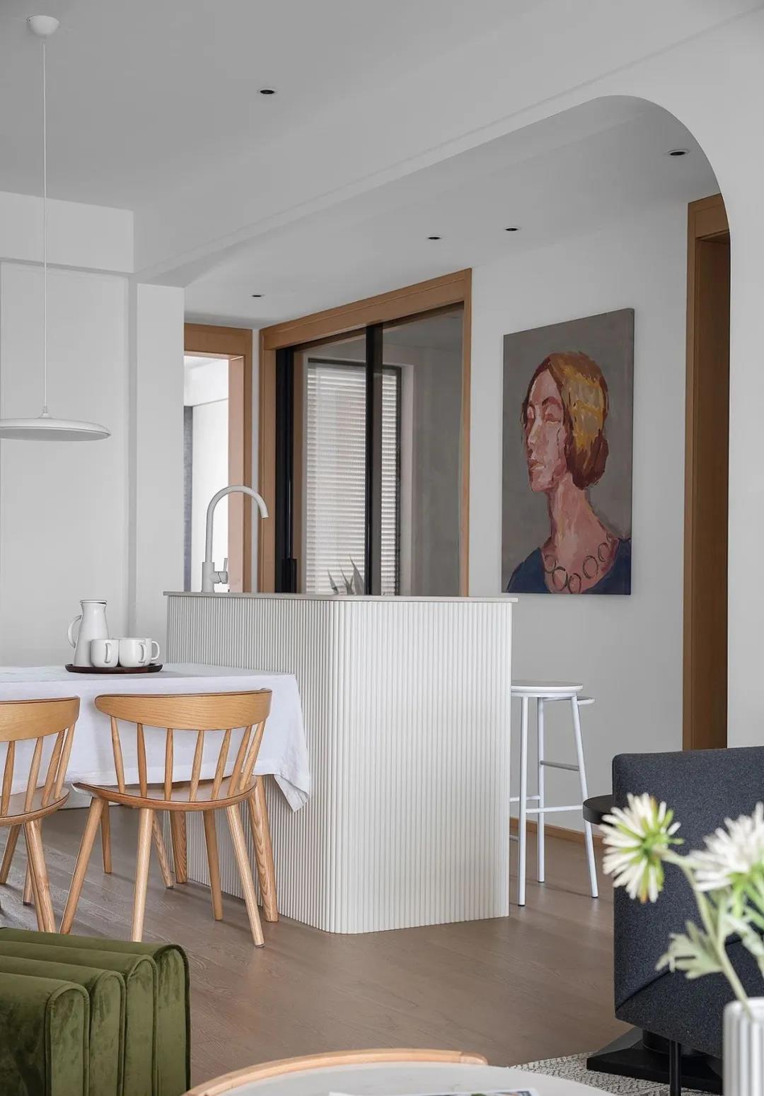 岛台链接着餐桌配一个高脚凳,运用白与木色主调,简洁质朴,岛台的波浪板与弧弓的柔和以及装饰画,尽显女主人之柔情