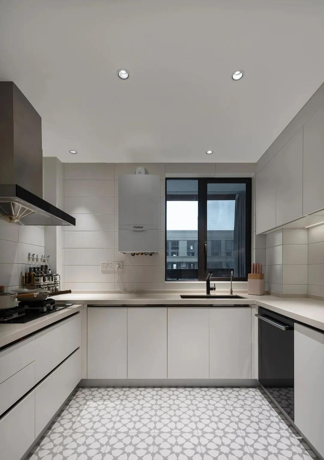 厨房,冰箱外置,解放空间,也让整体更加简洁明了,花砖地面搭配白色墙砖,石膏板顶面配置点光源照明,灶台区域做高低处理,更符合人性化设计
