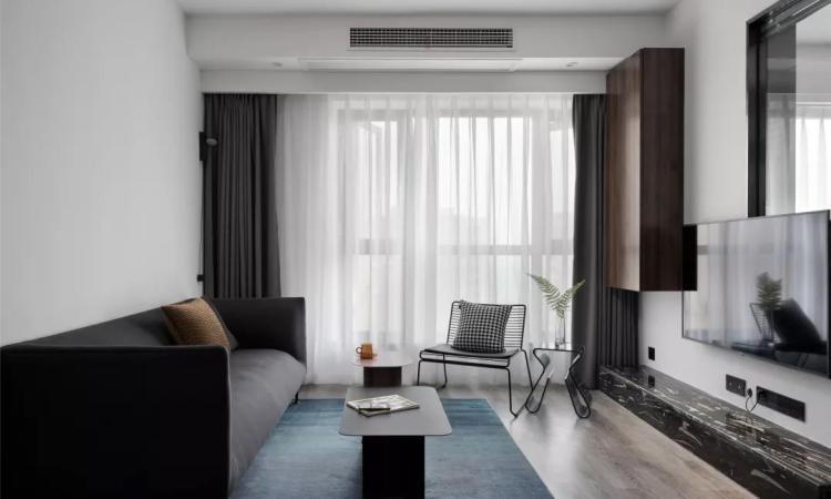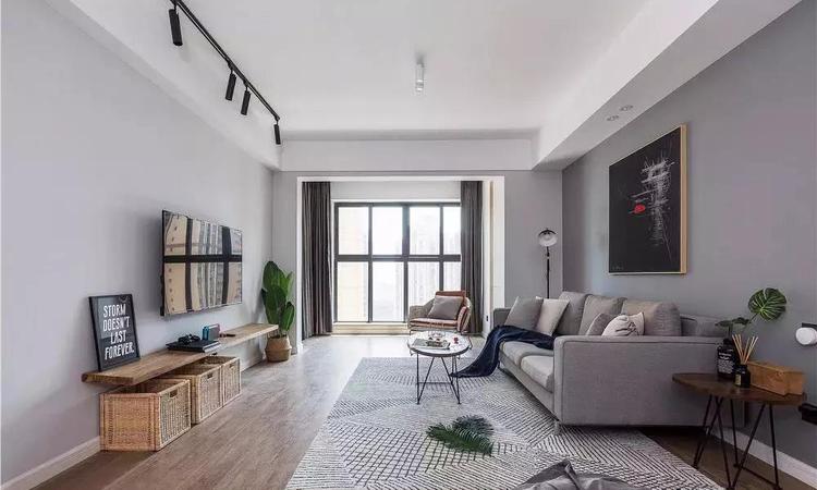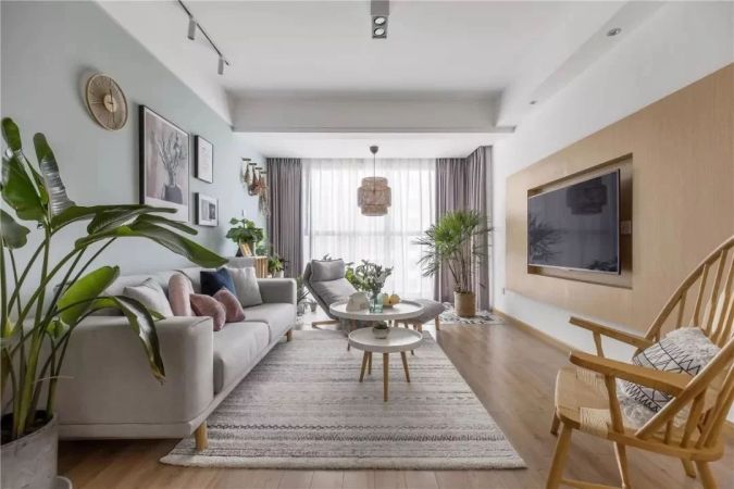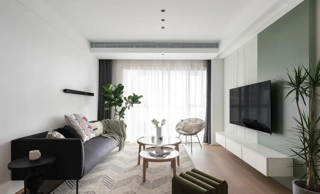 客厅,整体采用大面积的白搭配木色与绿色,简洁大方又温馨,用植物来点缀空间,点光源取代主灯,空间开阔明朗