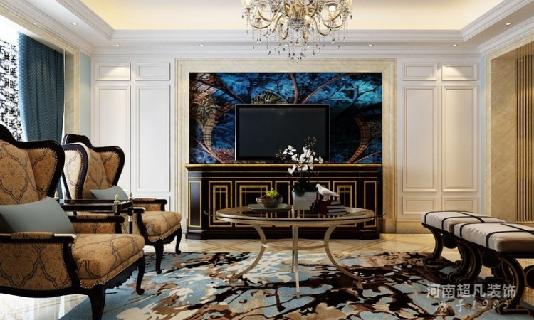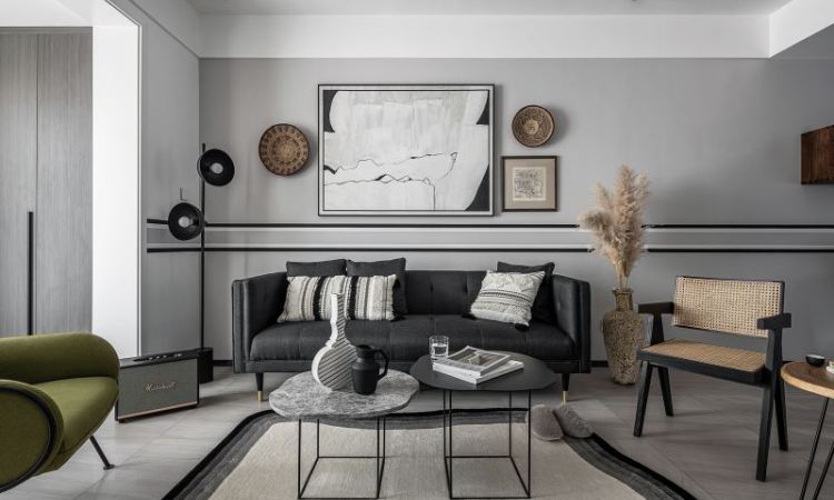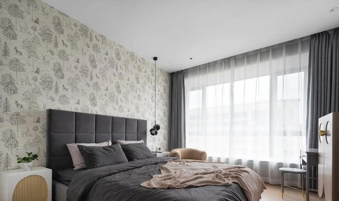 主卧,整体以灰白为主色调,用壁纸铺贴床背景,精致的首饰柜与慵懒的单椅沙发,丰富空间功能性