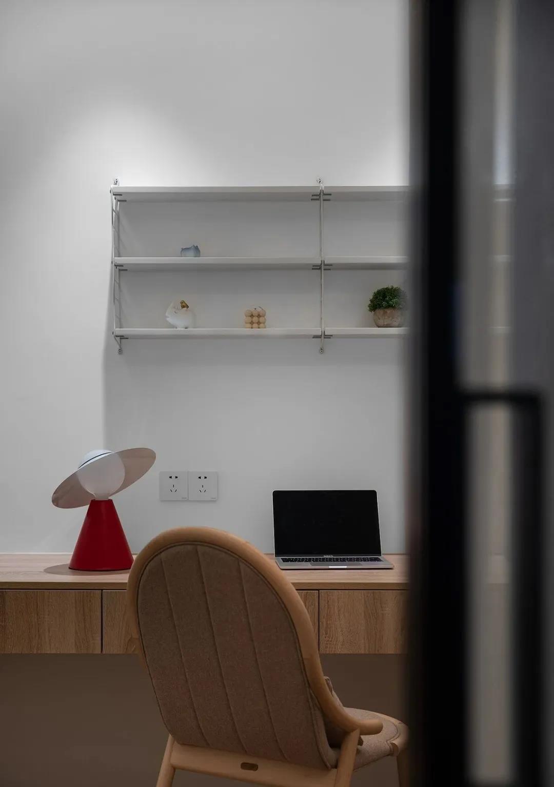 书房,整体延续白+木的基调,可容纳俩人位的书桌 ,随意摆放着自己喜欢的物件