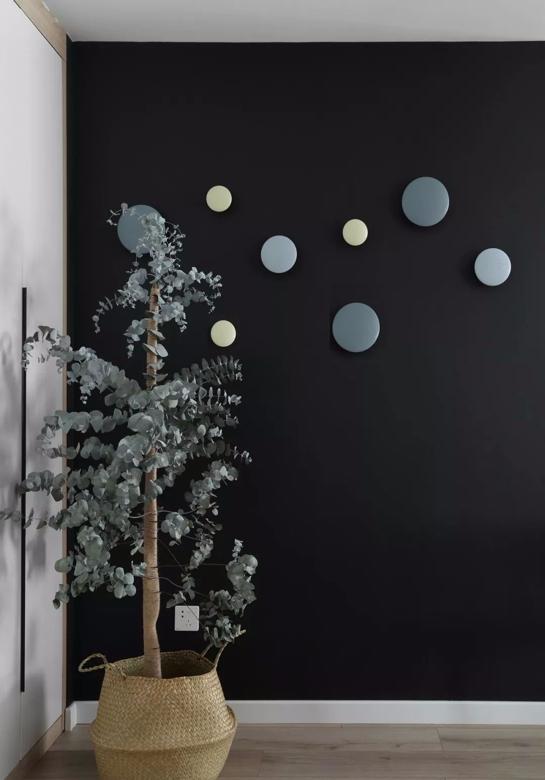 入户左侧打造了一排入墙式玄关柜,满足收纳的需求。正对入户门的是一面黑板墙,结合纽扣挂钩,有趣有实用。