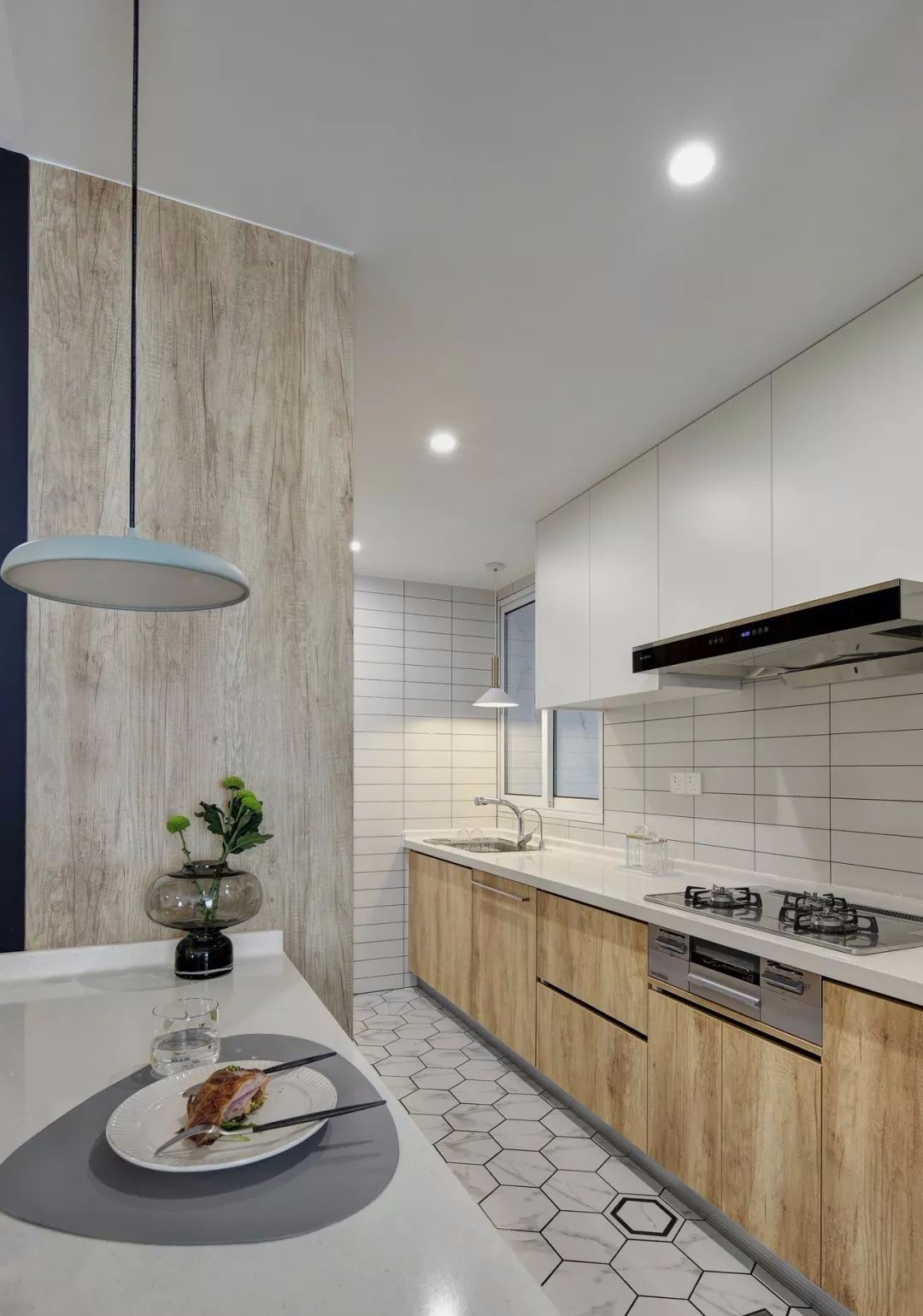 原本采光较弱的厨房空间,拆掉隔墙,开放式的厨房空间,改善采光的同时,也使整个空间变得开阔了许多。餐厅与厨房之间以吧台做为隔断,并通过地面的铺设,形成功能区的分割。