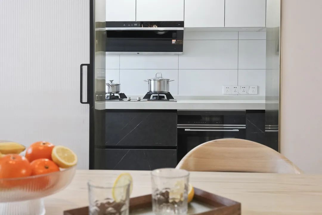 改造后的厨房采用了更显现代化的橱柜,厨房安装不锈钢门套,长虹玻璃门,下方拒绝安装轨道,进出厨房方便的同时又避免打扫日积月累的污垢。