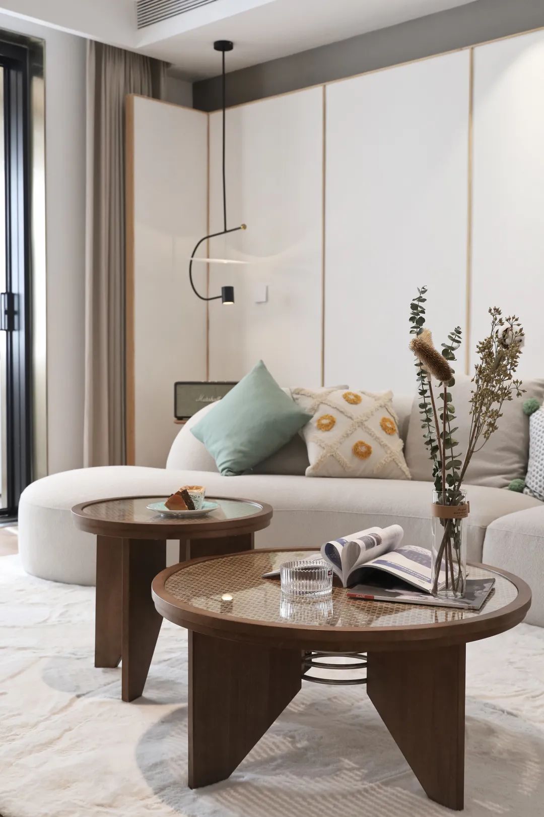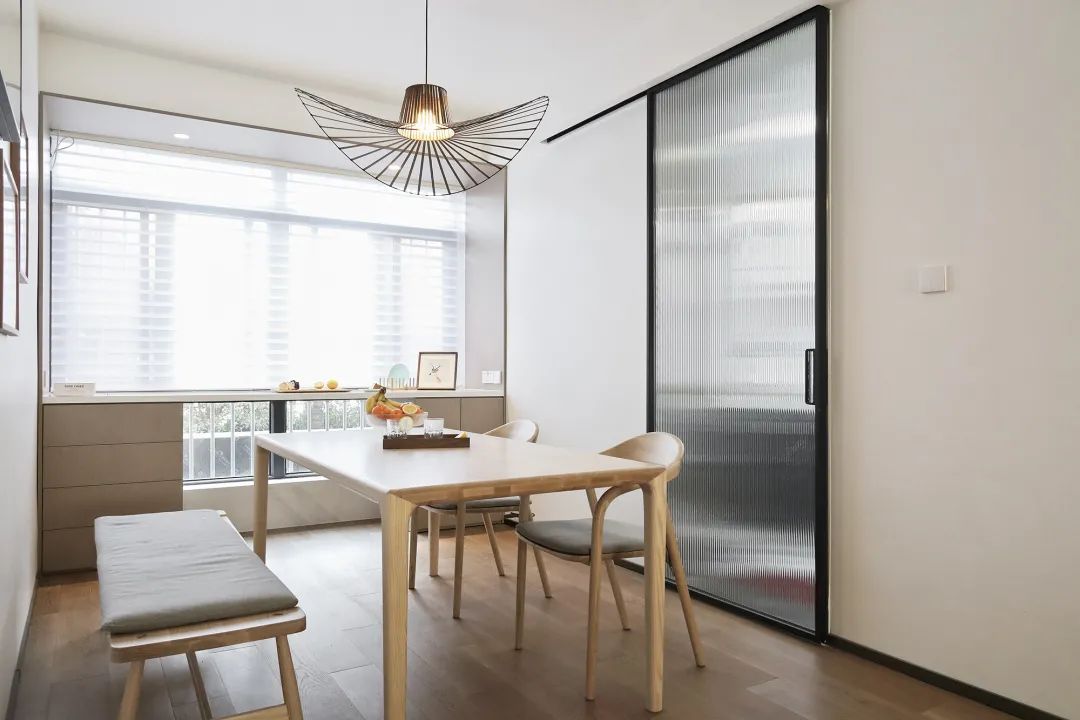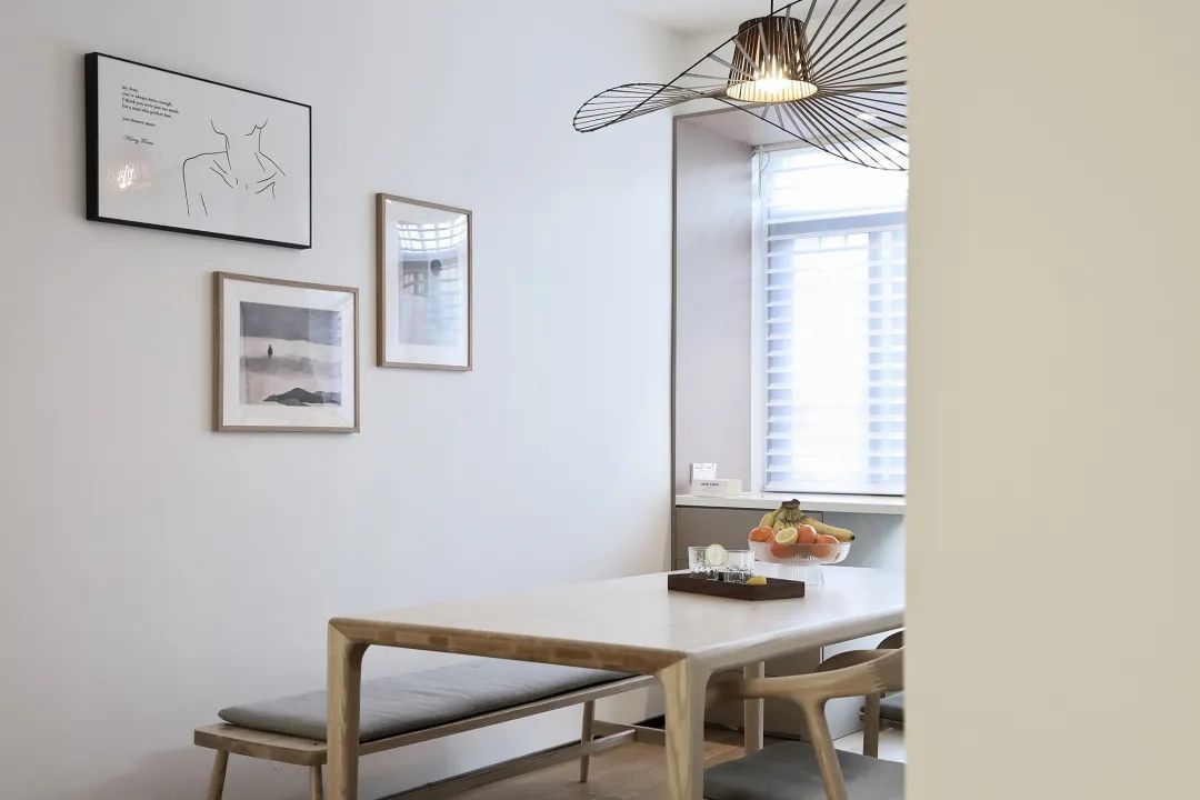 倚窗而做的餐边柜,给予了餐厅空间的多种可能,工作日可以作为快速解决早饭的早餐台,闲暇时间可以喝杯咖啡看看窗外的风景,周末时间可以和家人一起体验美好的烘焙时光,餐桌上方的藤编吊灯以它独特的材质和造型非常完美的融入到空间里。