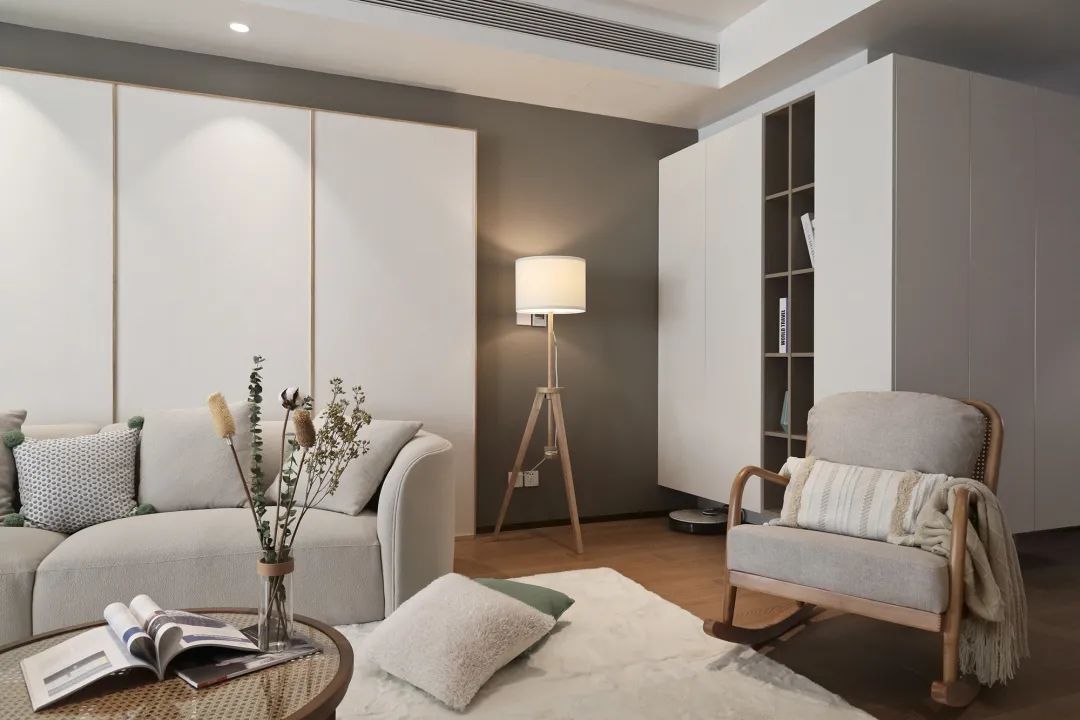 客厅为了保证吊顶的统一性,特意定制的加长出风口。整体色调多以灰色+白色进行构造,搭配原木色家具,加入充满活力的绿色植物,绿色靠包来进行点缀,打造整体客厅清新自然的整体氛围感。