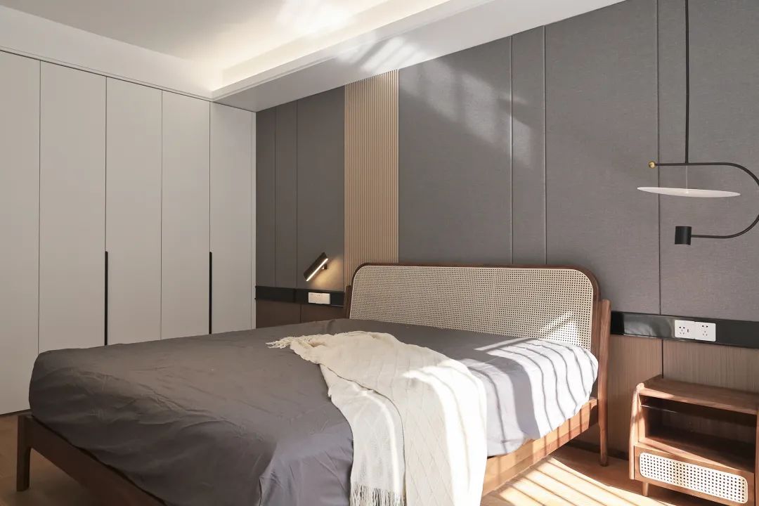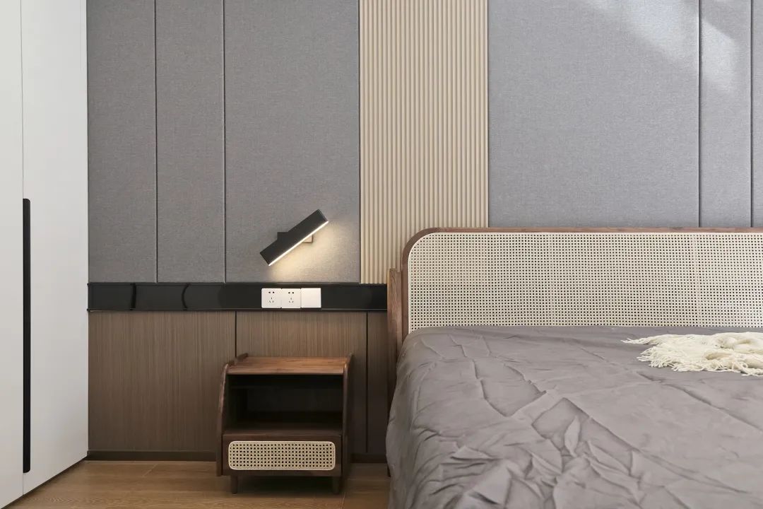 主卧宽大灰色硬包下方嵌入不锈钢金属,体现了理性、冷静的氛围,纯白色的立体柜门,灰色+白色的色调让空间舒适,天然藤编的床头融合进了这个略显理性的氛围,增加了自然舒适的氛围感。