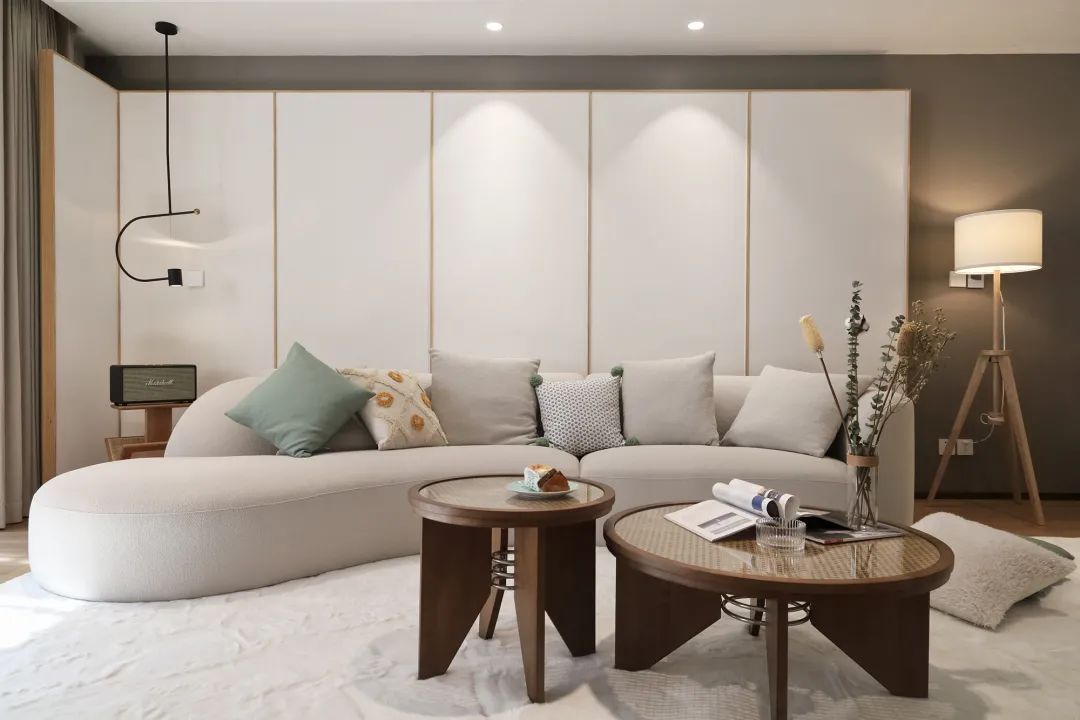 相对应的玄关柜门与客厅沙发后面的隔断统一采用白色,同时嵌入的柜体采用原木色板材与家具的材质互相呼应,使空间具有连续性和整体氛围感。