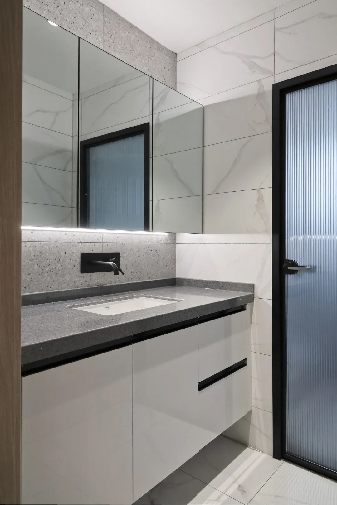 浴室柜使用嵌入式水龙头,简洁率性的同时减少浴室柜的卫生死角。 浴室柜下方暗藏灯带,柔和的灯光处处隐藏着设计师的小心机。