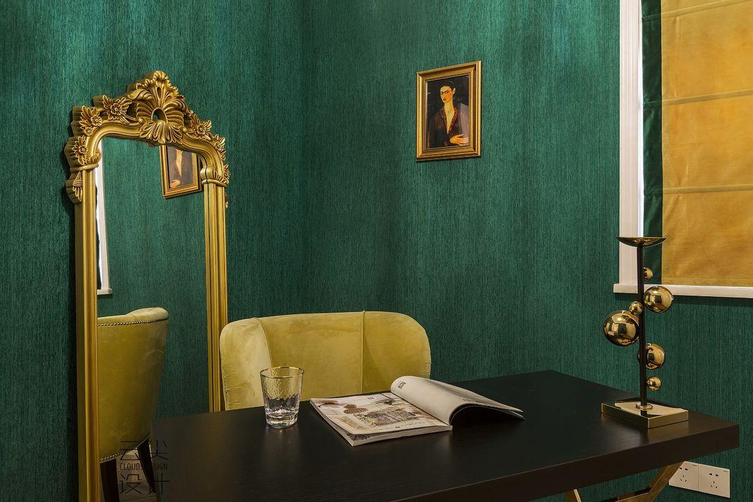 书房作为独立空间。大胆的使用了黄色和绿色这对中差色作为主色调。辅以黑色。中差色在视觉上是有很大的配色张力效果。