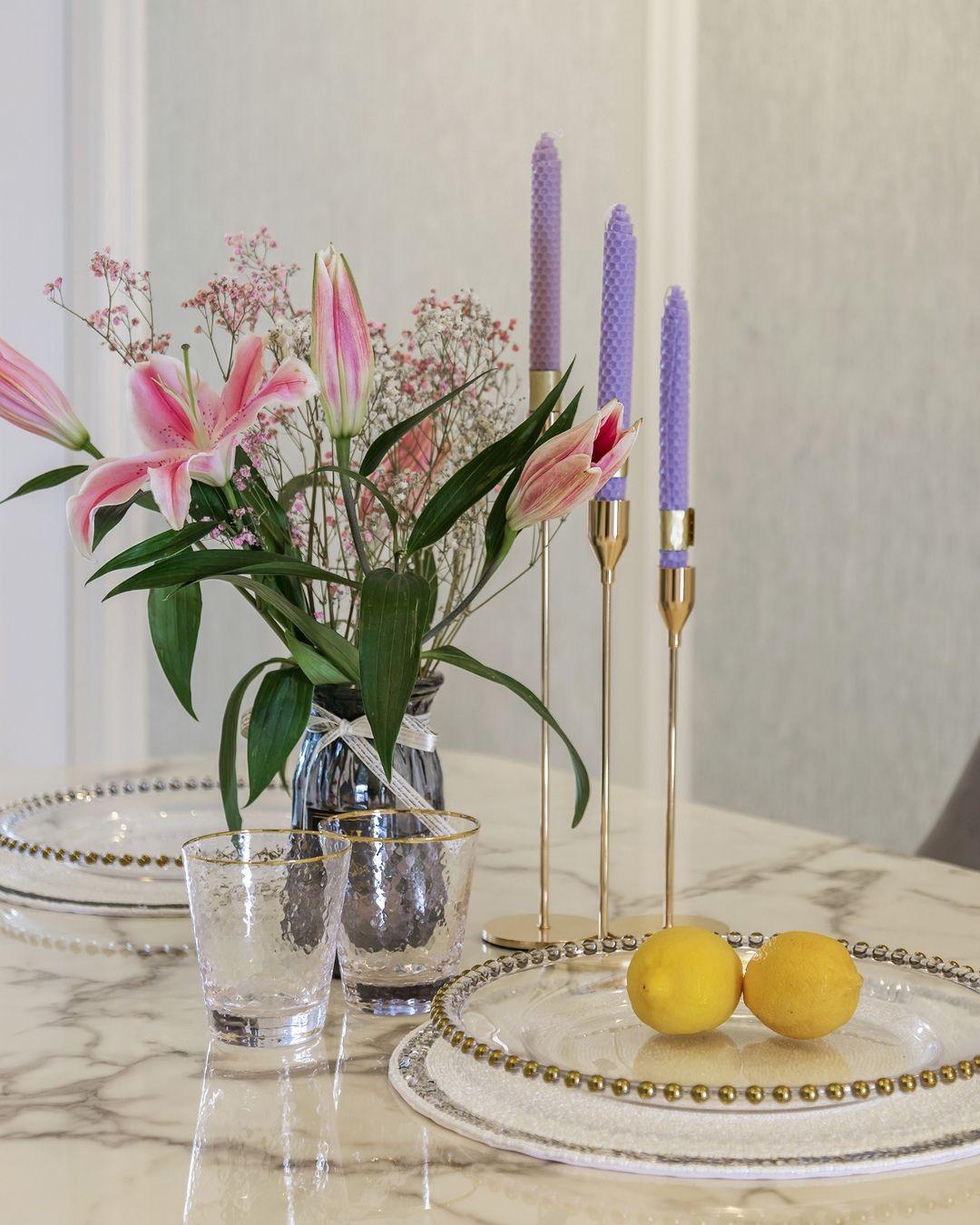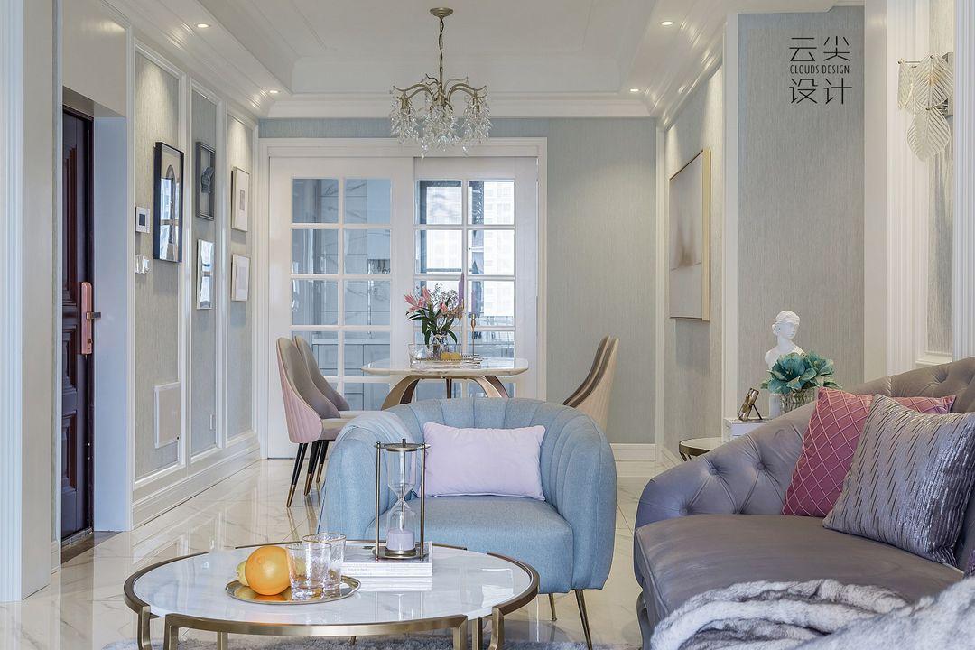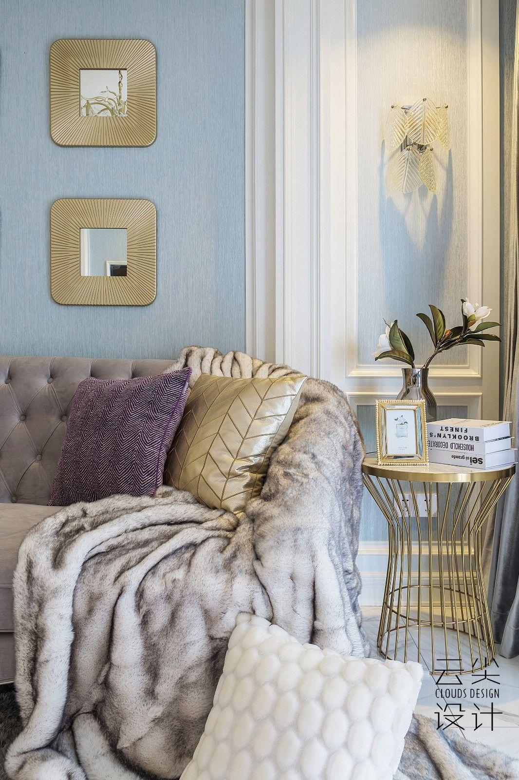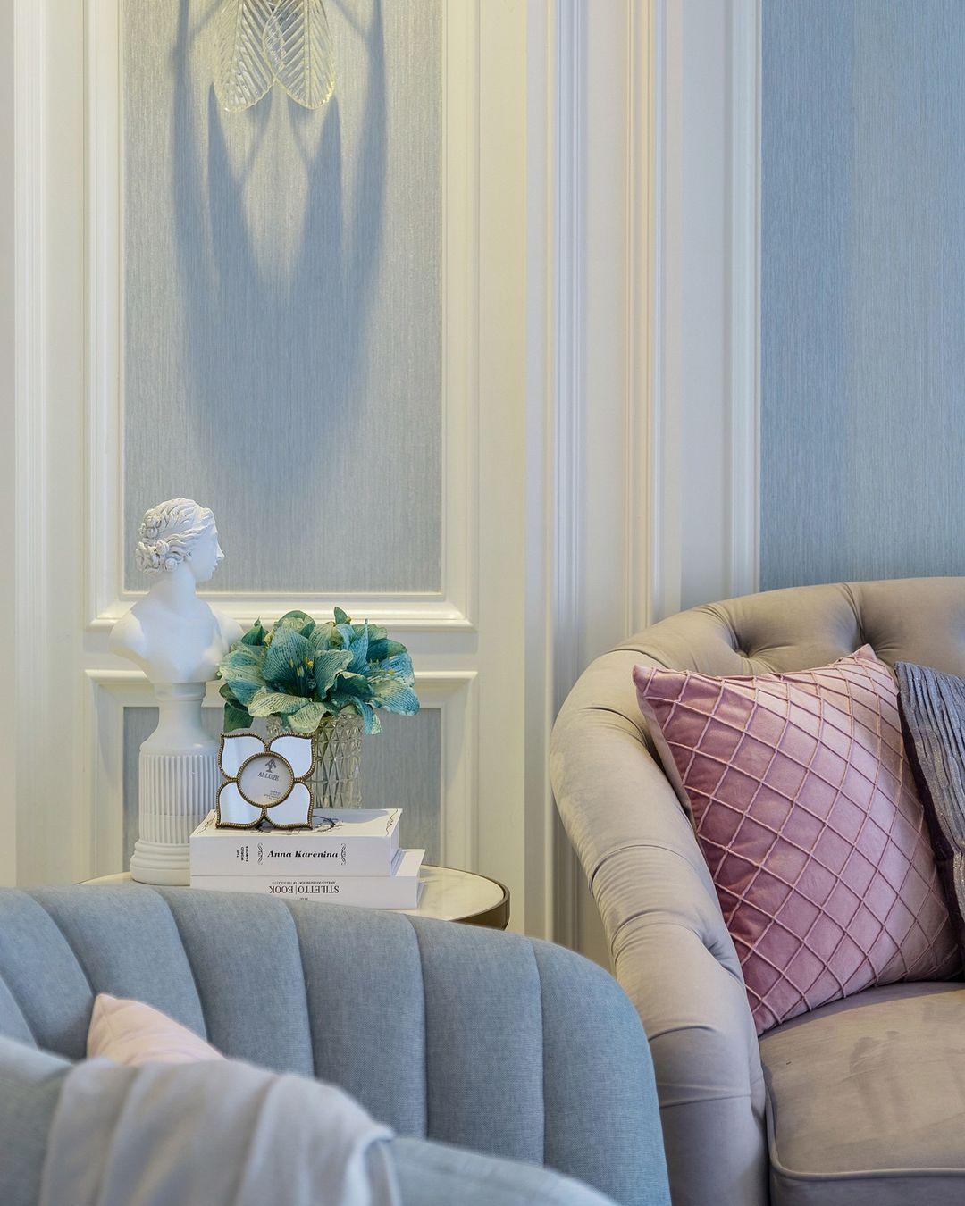 一旦空间有了大面积的颜色后期颜色就很需要谨慎搭配,一不小心就会显得很乱,所以我们在大件的选择上 用了灰粉紫作为搭配色也能有一些冷暖的碰撞,家具的金和装饰灯具也有了一点点的精致,但又不能太抢镜,运用了毛绒的织物和地毯,打破了整体的冰冷