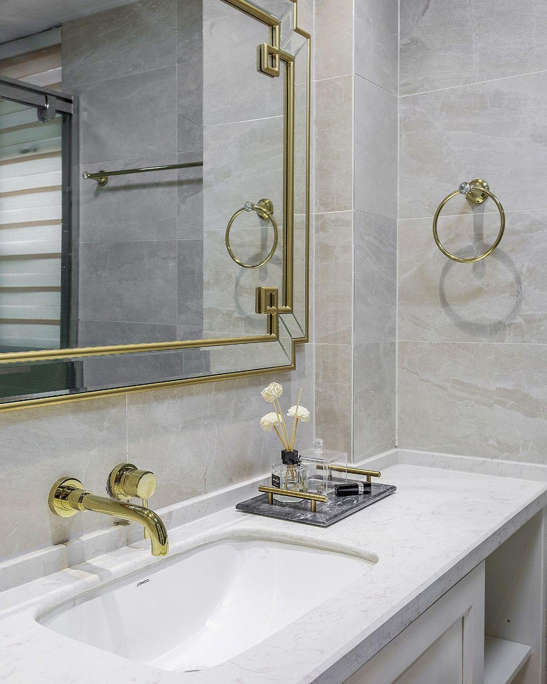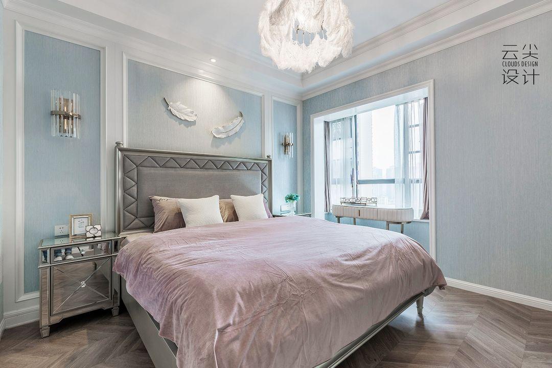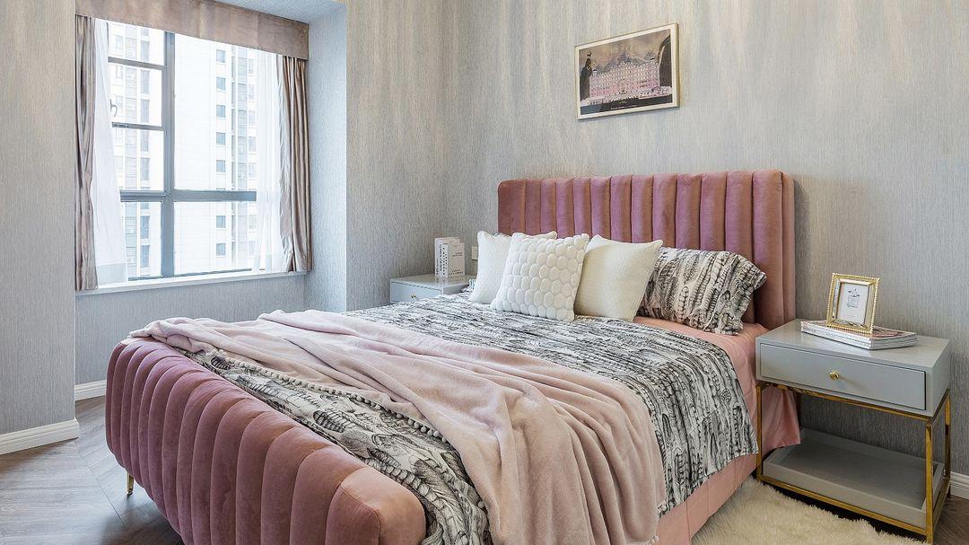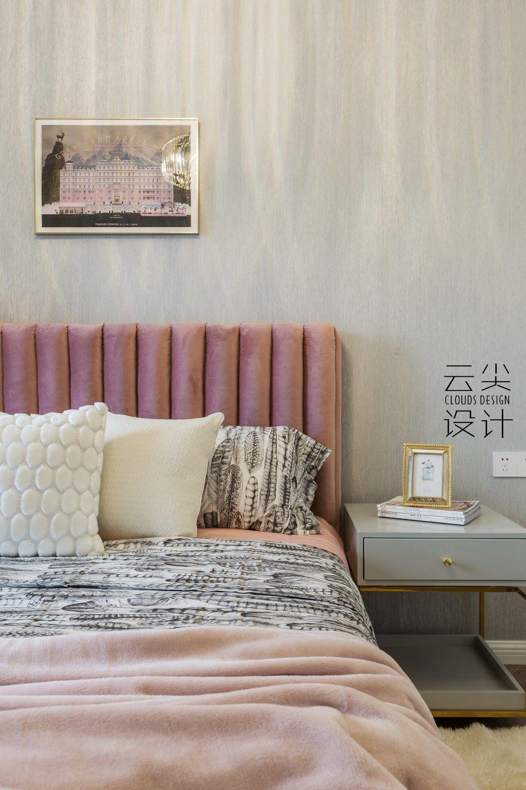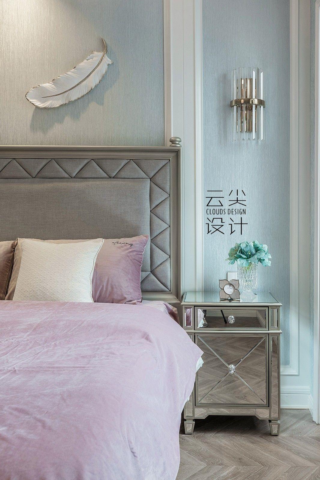 卧室也选用了框线墙板作为主卧造型。搭配羽毛,金属等元素。营造出轻盈,柔软的轻奢氛围