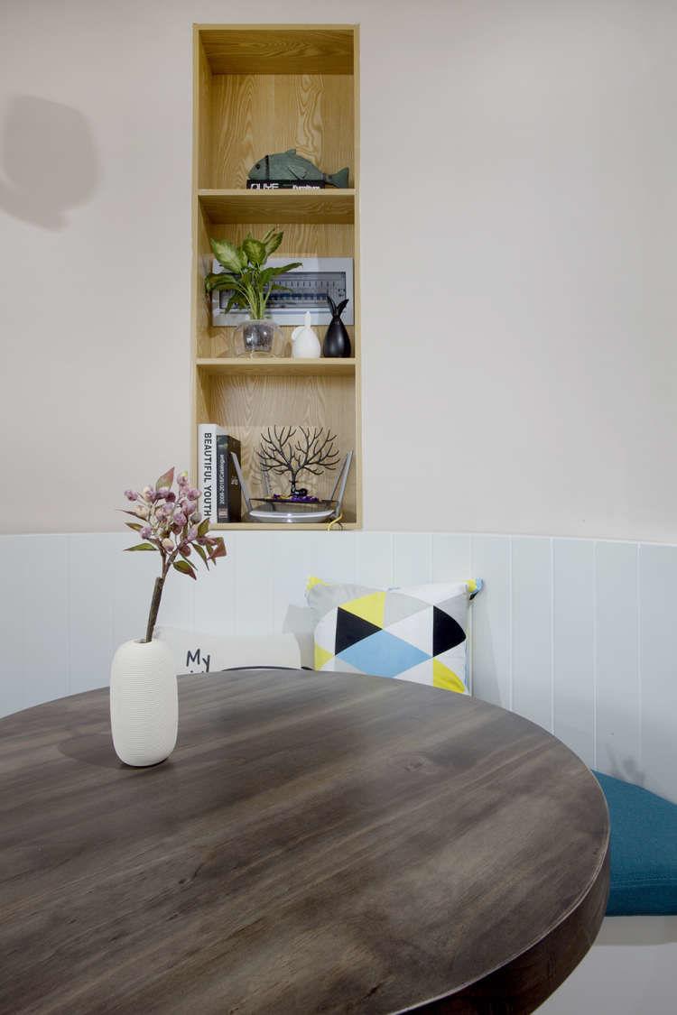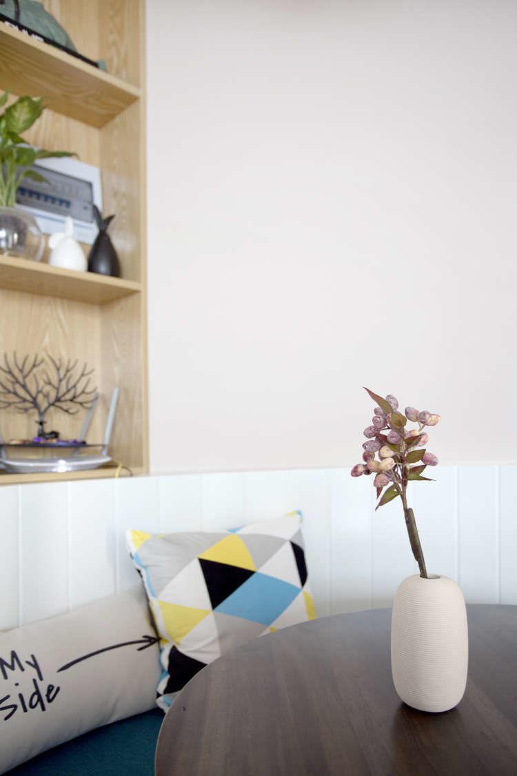 递进式的隔断墙像是在墙里掏出来的一个个小洞洞,也有趣味性。跟地板同款的木质踢脚线,是在施工的时候,让工人把墙体底部砸开一道空间,然后把踢脚线嵌到里面,跟墙面找齐在一个完成面上的。这样的好处,是直接可以避免踢脚线凸出来的边上落灰。