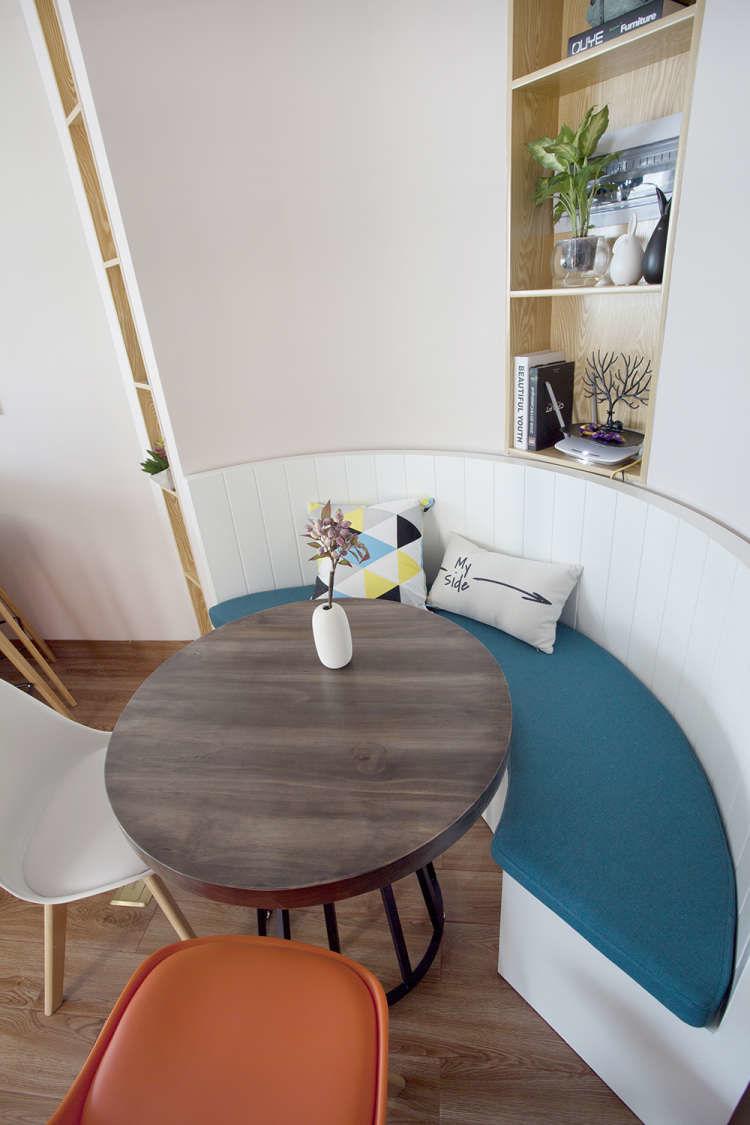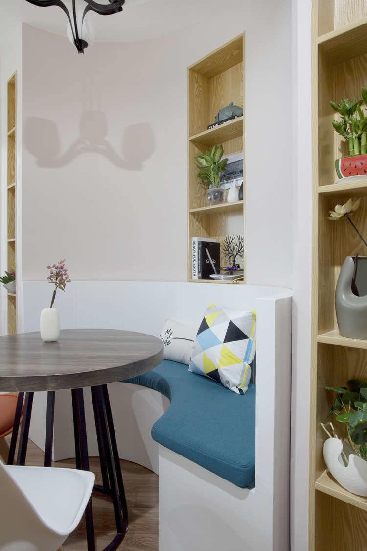 弧形卡座餐厅是空间中的一大亮点,有效舒缓硬装因方正带来的棱角感,还能增加视觉上的扩张。