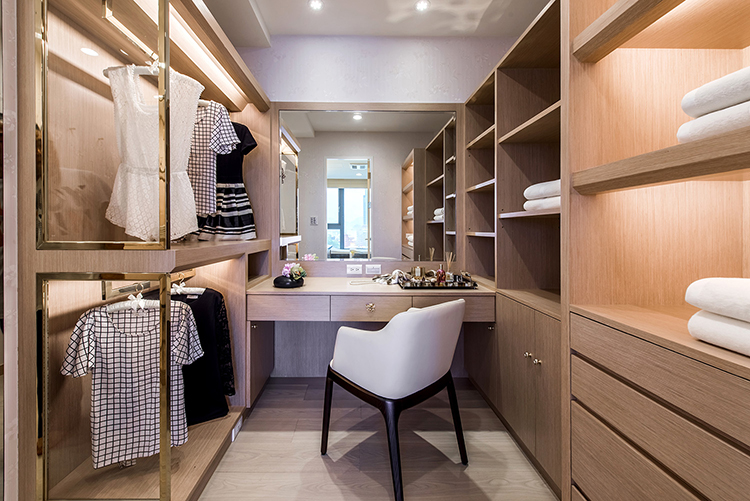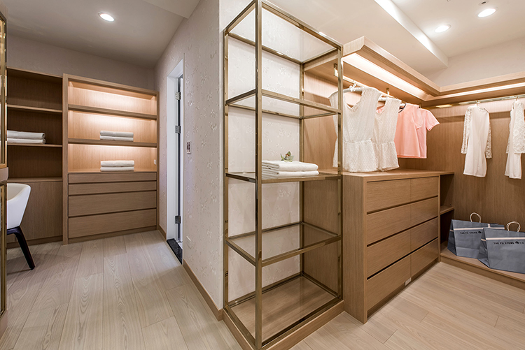 独立式的衣帽间空气流通效果好,视觉上也很宽敞,抽屉与挂衣区的分工设计,能完美解决空间中不同衣物的储存需求,又让整个住宅尽显高雅奢华气质。