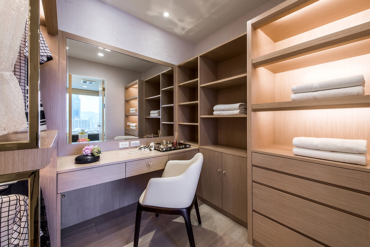 而除去储物空间,梳妆桌也是整个衣帽间不可或缺的元素,搭配镜面灯和嵌入式灯带造型,这样做不仅不影响整体的美观,而且很充分了利用了空间。