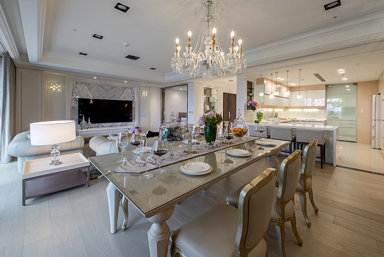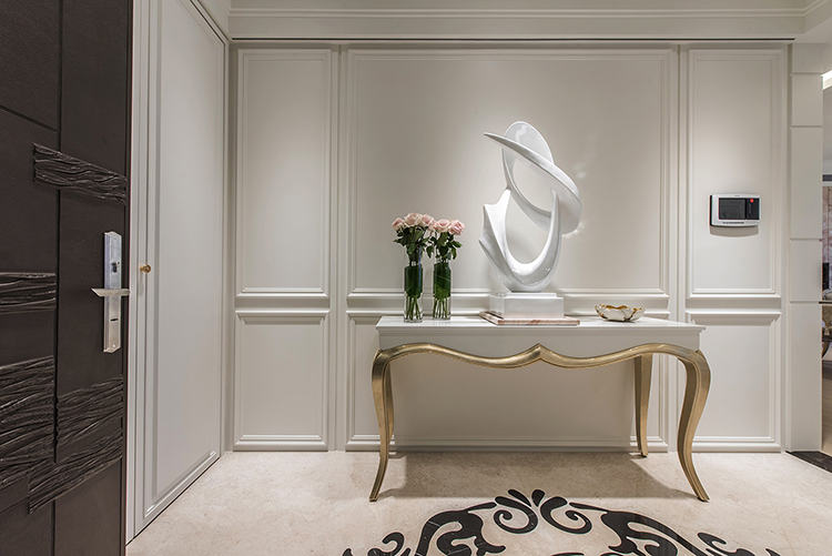 而在穿过过道门的位置,整体色彩选择打破以往欧式深沉的色彩,大量使用的白色调,把欧式风格设计融入现代设计中,浑然一体,高贵感油然而生。
