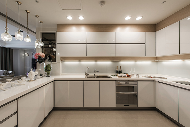 这间大气而自然的烹饪区,设计师除了采用白色调做了橱柜和吊柜,还少不了原木地板以及嵌入式灯带的点缀,让空间体现了浓浓的时尚现代感,也更为高雅。
