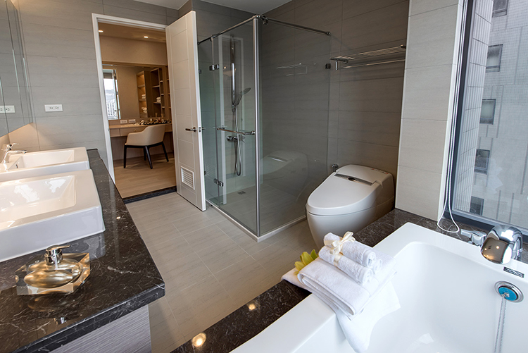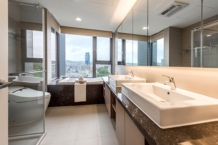 因为有足够的面积,所以空间内兼备了浴缸以及淋浴区,搭配白色的家具主调,营造出一种柔美浪漫的意境,让洗漱也成为一种十分具有艺术感的事情。