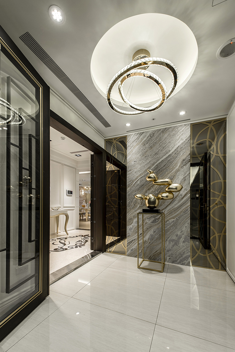 进门即见奢华魅力,个性十足的水晶吊灯、天然大理石配合玻璃定制的背景墙、大气宽敞的过道门,都让居室展现出独具特色的魅力,奢华感十足。