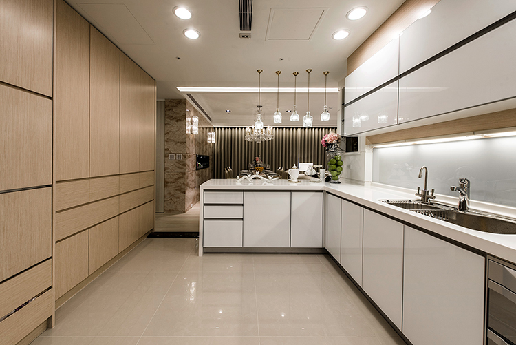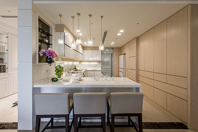 非常大气安逸的厨房也是空间打造的重点,白色的主调给人感觉自由奔放、优雅舒适的感觉,再加之搭配原木色的点缀,让空间布局设计和划分都非常明确。