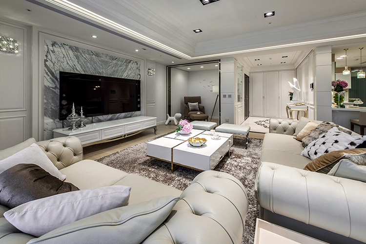 软装是延续了欧式家装的经典搭配,皮质的白色三人座沙发、沉稳的深色调地毯、大理石的电视墙以及洁白的实木电视柜,都是组成空间不可或缺的元素。