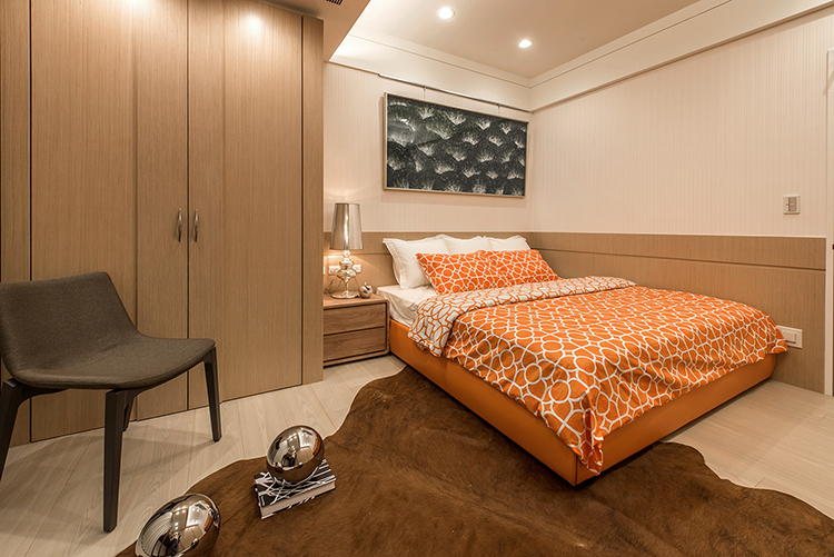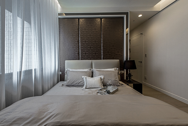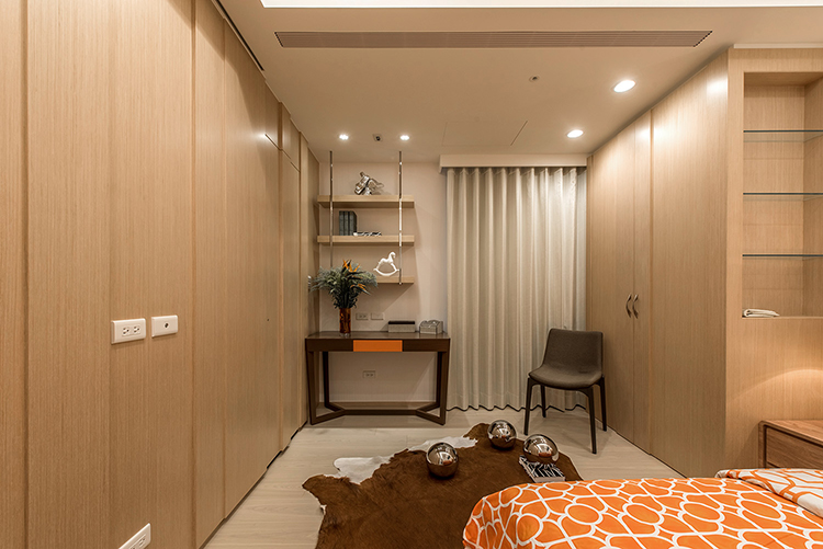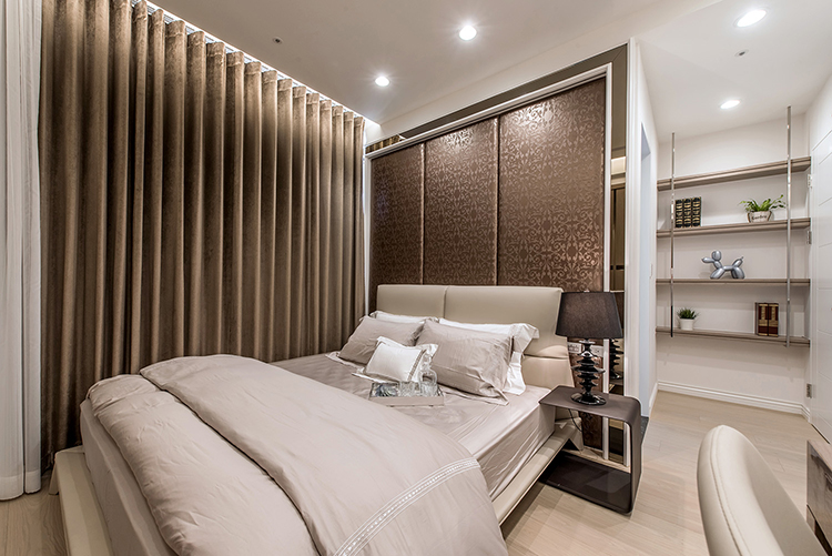 次卧3时尚大气是该卧室的气质特点,皮质睡床、嵌入式的筒灯设计、金属隔板的储物架,无不彰显居住者的高贵奢华范,同时还具备有独特的休息空间韵味。
