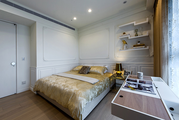 次卧2运用了简洁自然的白色主调,搭配墙面雕花线条的设计,让空间立体感和艺术感给人品味超群的印象,同时书桌等功能家具注入,形成了完美的生活空间。