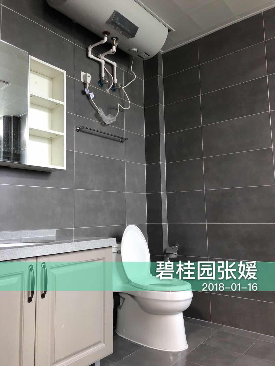 卫生间延续了厨房的设计,灰色的背景墙搭配乳白色橱柜,复古时尚。