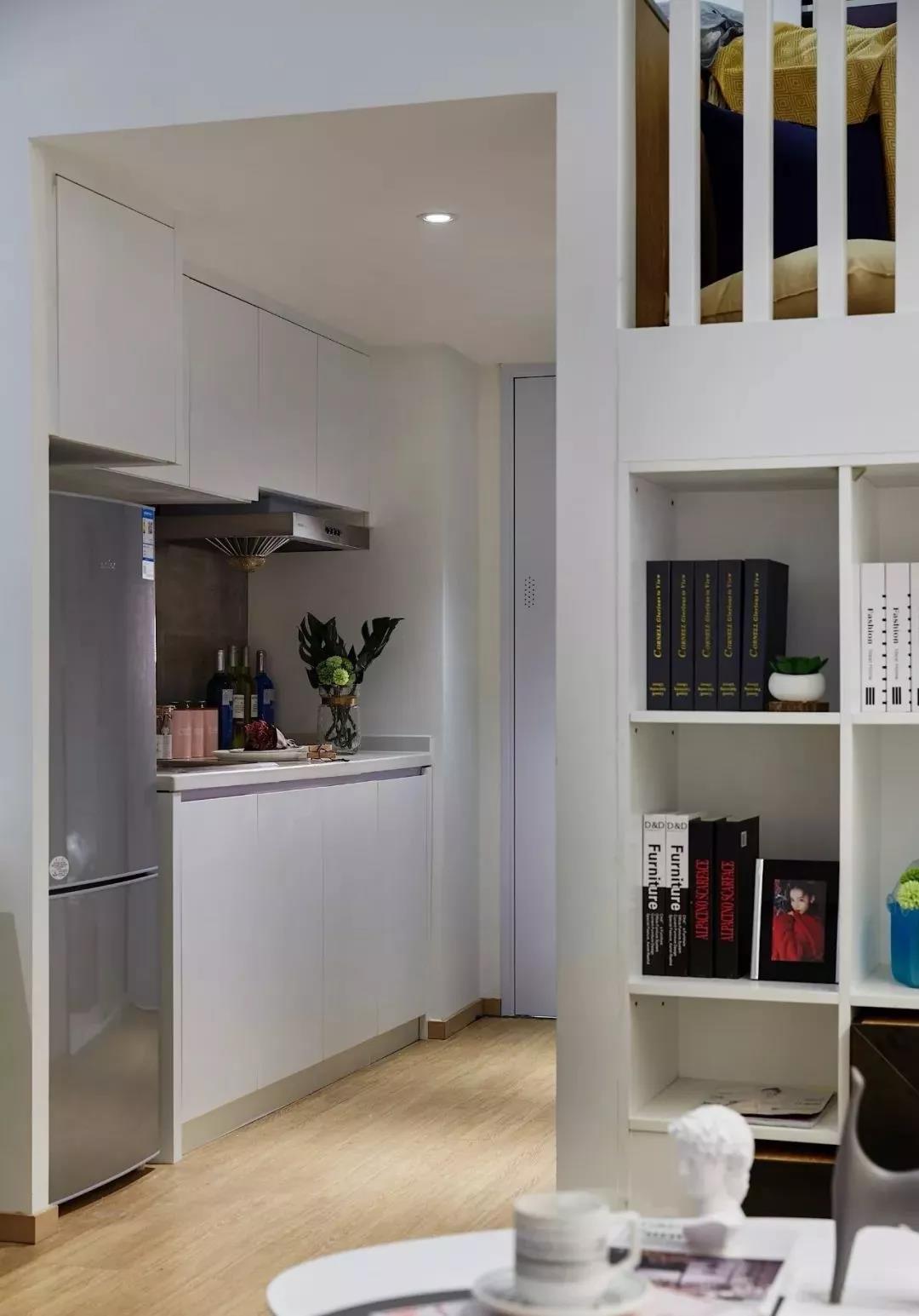 入户的玄关走廊和厨房是结合在一起的空间,冰箱被嵌入在了橱柜的边上,水槽选择了舍弃,毕竟这个玄关走廊的面积比较小。