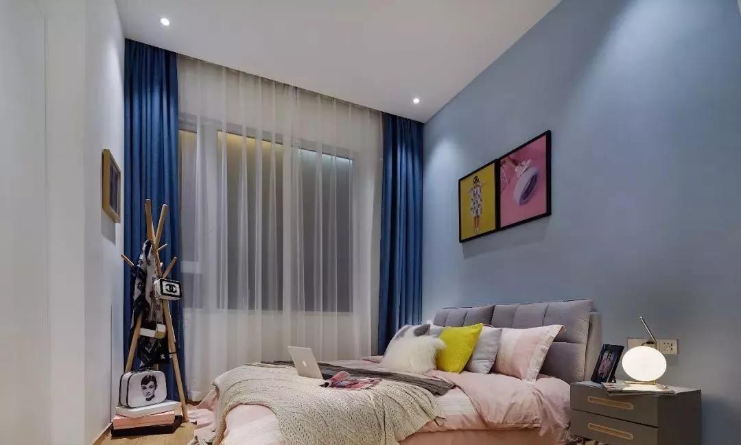 主卧室的空间也不是特别宽敞,床尾做上了嵌入式的柜子,角落里还摆放了衣帽架方便平时堆放衣服,背景墙上点缀两幅装饰画。